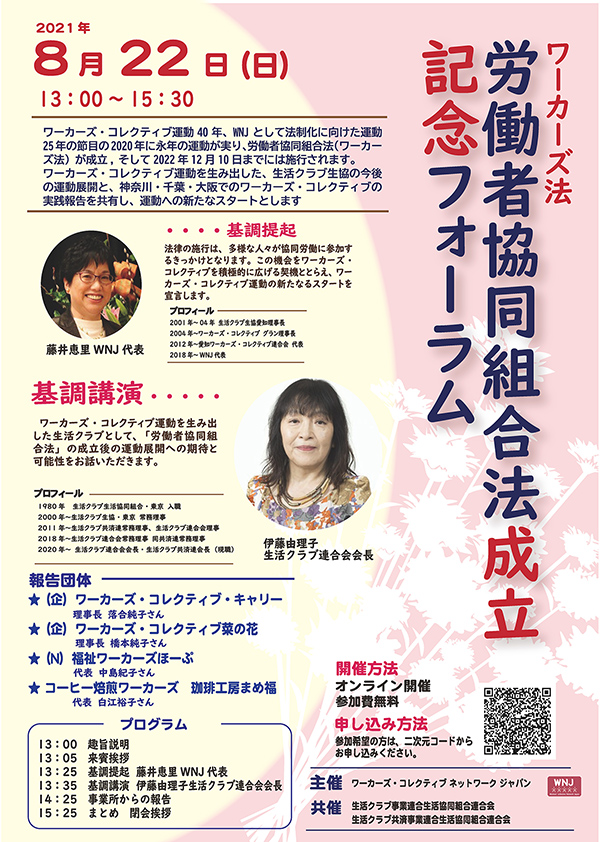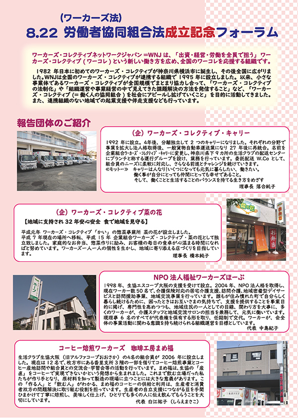 それを記念して、ワーカーズ・コレクティブの全国組織ワーカーズ・コレクティブネットワークジャパン(WNJ)が「労働者協同組合法成立記念フォーラム」を開催します。