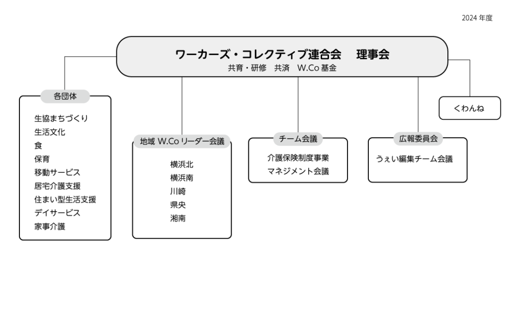| 目的 | W.Coの連合の力をもって、その事業と運動の発展を推進し、「市民資本セクター」の拡大、「参加型システム」の構築を目指す。 W.Coの事業・活動の課題解決、制度政策・提言活動の場。 |