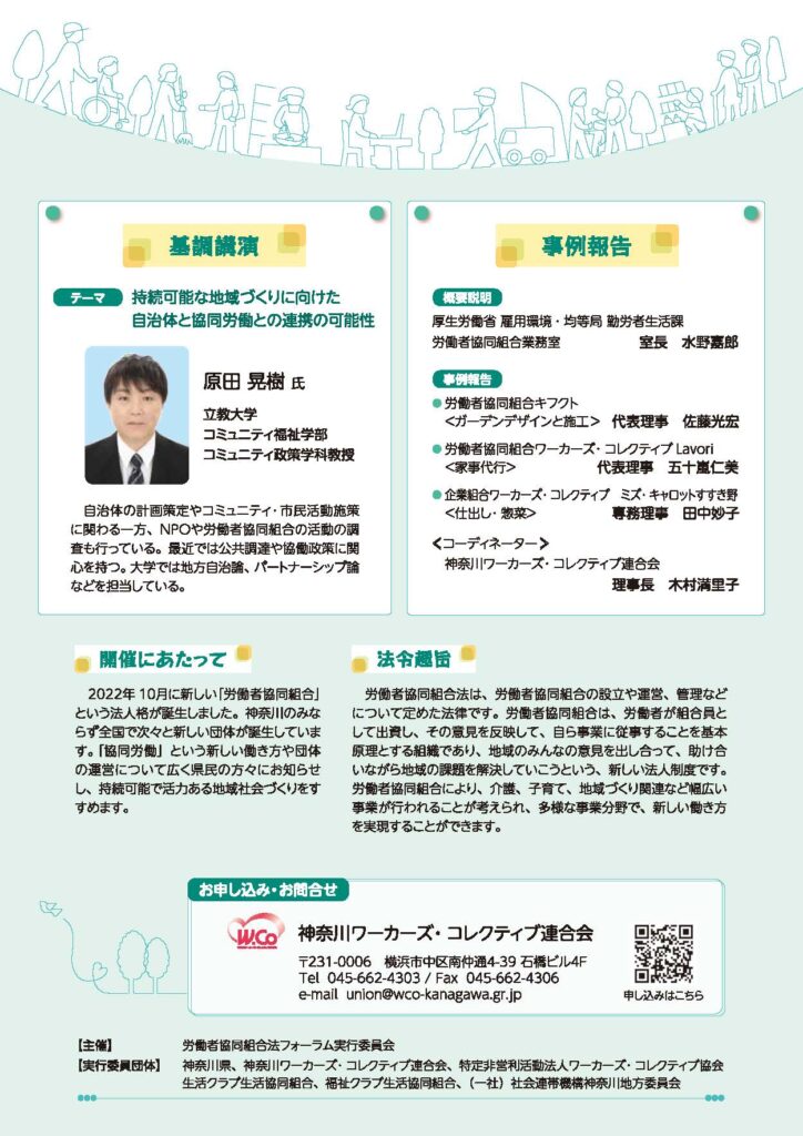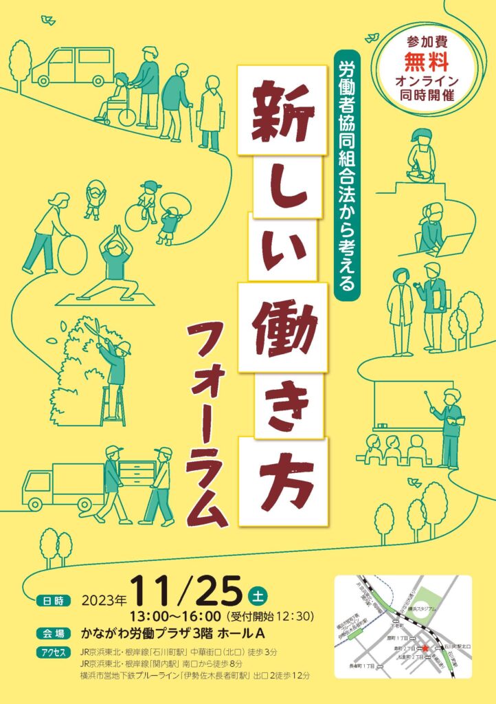 2022年10月に新しい「労働者協同組合」という法人格が誕生しました。神奈川のみならず全国で次々と新しい団体が誕生しています。「協同労働」という新しい働き方や団体の運営について広く県民の方々にお知らせするとともに、持続可能で活力ある地域社会づくりをすすめていくためにフォーラムを開催しました。