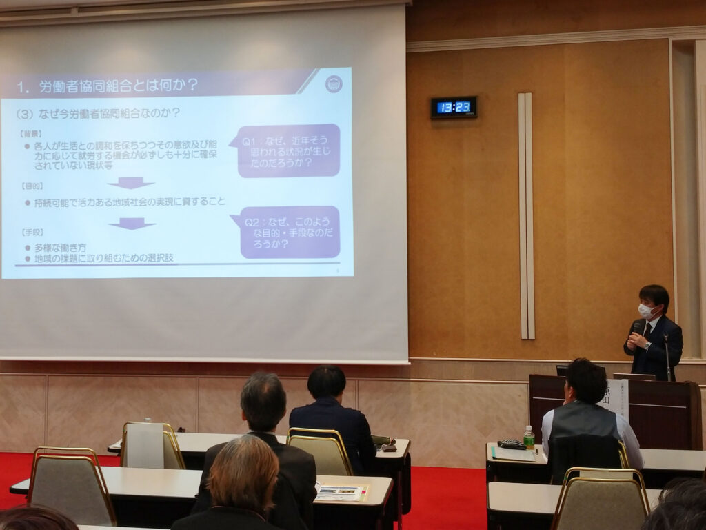 労働者協同組合は、働く人が組合員として①お金を出し合い②運営をみんなで議論して③一緒に働くという組織であることや、労働者協同組合に求められる役割や他の法人との違いの説明がありました。