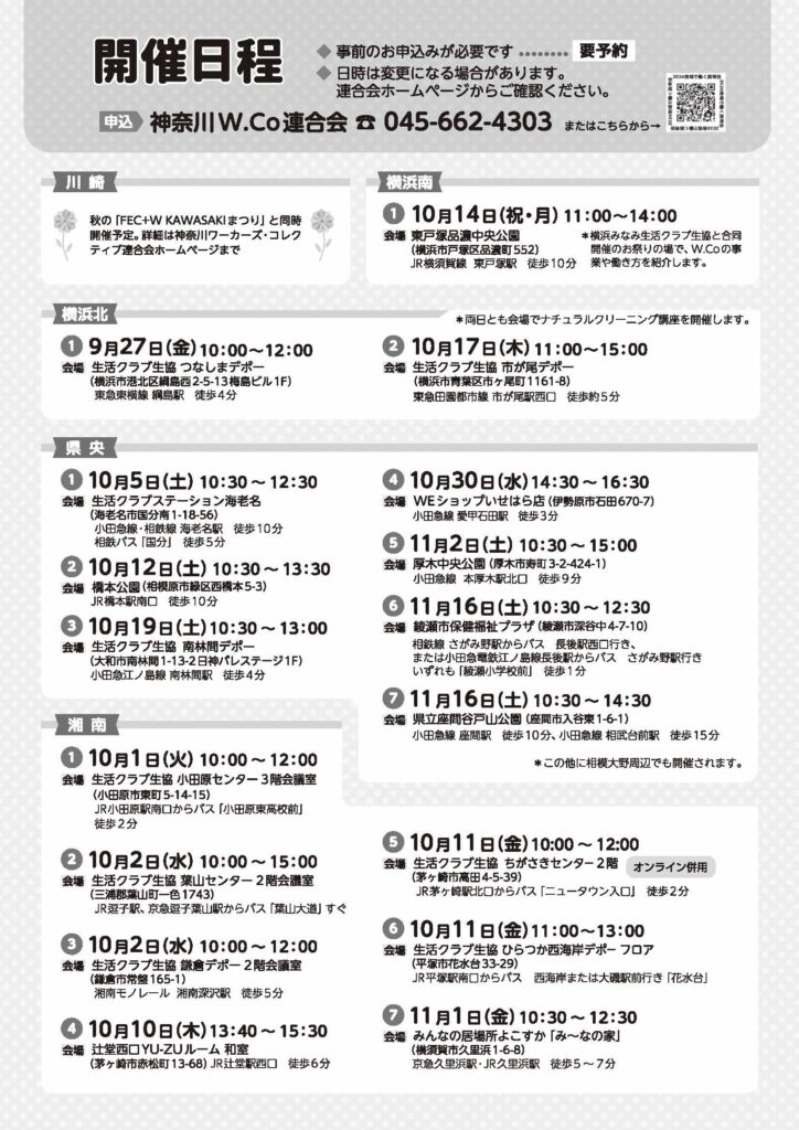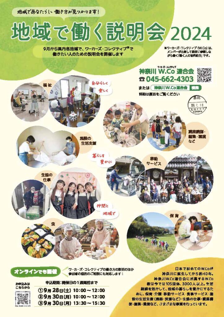 10/14(祝・月)11:00~14:00東戸塚品濃中央公園横浜市戸塚区品濃町552横浜みなみ生活クラブ生協と合同開催のお祭りの場で、W.Coの事業や働き方の紹介を行ないます。