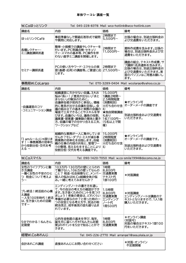 単体W.Coで専門の講座を行いたい場合は、直接W.Coに依頼して下さい。