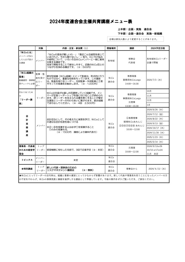| 第1回 | 9月26日(木) 10時〜12時30分 | ①W.Coの経営 ②トップリーダーの役割 ③自組織の会計の見方・課題分析 ④事業計画・予算の立て方 ⑤中期事業計画をつくる ⑥各W.Coの計画へのフォローアップ ※内容を一部変更する場合があります | 毛利大輔氏 (W.Co連合会元理事、 連合会支援スタッフ) |