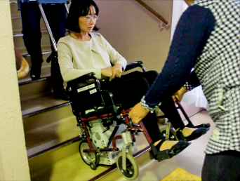 エレベーターのないマンションの3階から、車いすの利用者を階段昇降機を使って降りてもらい、リフト付きの福祉車両で通院をサポート