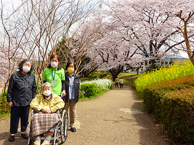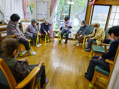 午前中はバイタルチェック、朝の会後、主に体操などで機能訓練、心身機能維持を図り、午後は週単位で計画を立て、ボランティアによる歌や踊り、脳トレ、またスタッフリーダーの企画で手工芸やレクリエーション、歩行訓練と季節の花などの鑑賞も兼ねて公園などに外出します。