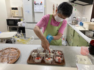 「食」を通してご入居者の生活の質を高めるために、月に1回手作りおやつを提供しています。見た目も美味しそうに、味にもしっかりこだわり季節感あふれるおやつを提供できるように、メンバー同士話し合いながら作っています。皆さんの笑顔が見られるのが一番の喜びです。