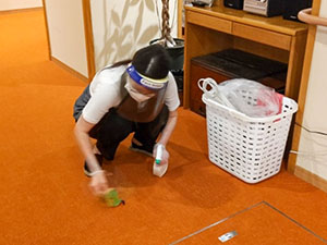有料老人ホーム内で、介護居室の清掃やリネン交換、ご入居者の衣類の洗濯、施設共用部の清掃を行っています。その他、ご入居者からのご依頼(ワックスがけ、エアコンフィルター清掃、カーテンの洗濯など)に対応しています。