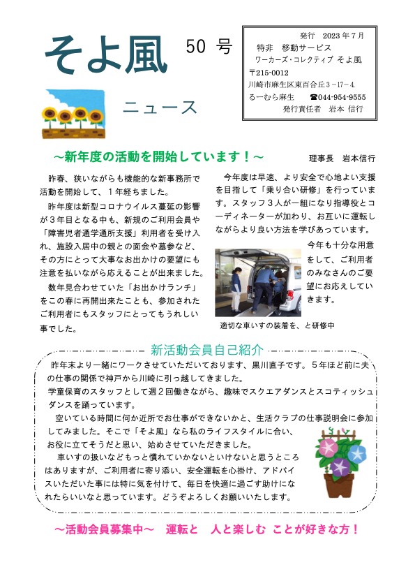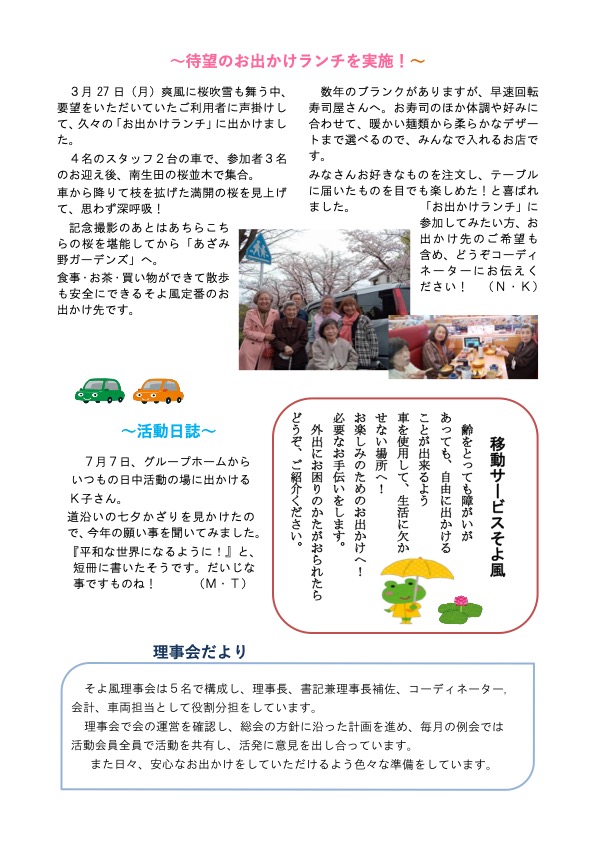 | 事業内容 | ・公共交通機関を使って一人での外出が困難な、高齢者や障害・病気を持った方の外出支援サービス(福祉有償運送) ・川崎市障害児・者通学通所移動支援(川崎市指定事業) ・お出かけランチ(そよ風自主事業) |