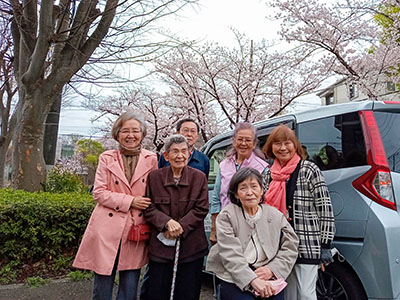 希望ご利用者を募り、お出かけする企画事業です。昼食のお店に行く前に、季節によって花や景色などを楽しみ、昼食後はお茶や買い物をするというミニお出かけです。